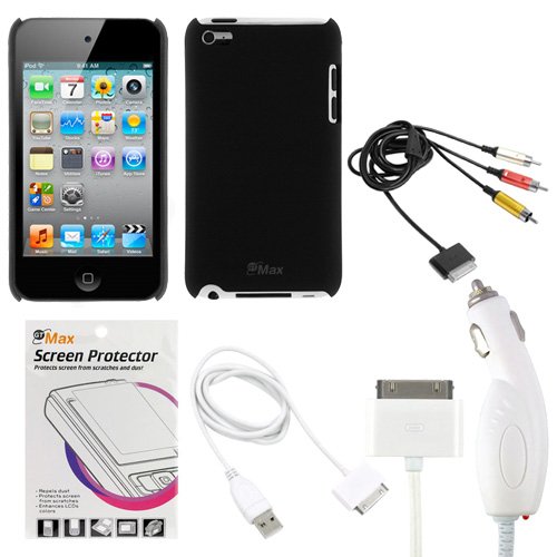 EVOPower Rapid White Car Charger + White USB Hotsync & Charging Data Cable + AV TV Video RCA Cable + Black Rubberized Hard Protector Cover Case + Clear LCD Screen Protector for Apple iPod Touch Itouch 4G 4th Generation Review